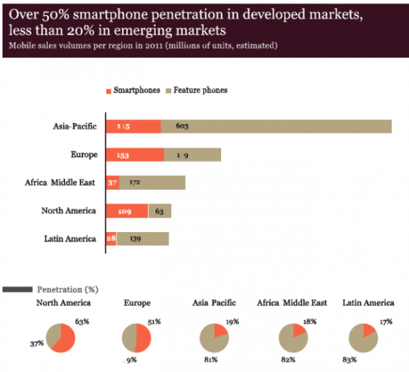在北美和歐洲市場上,智能手機滲透率是最高的,在各自市場上所占份額分別為63%和51%。相比而言,亞太地區(qū)、非洲和中東地區(qū)、以及拉美地區(qū),滲透率則要低得多,依次分別為19%、18%和17%。