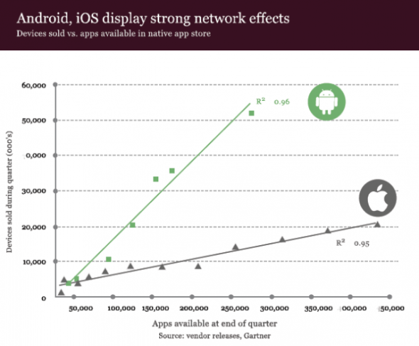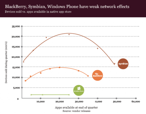 一件有趣的事情是,從手機應(yīng)用這方面來看,所有排名靠前的智能手機廠商的網(wǎng)絡(luò)效應(yīng)都能表明其產(chǎn)品的受歡迎度。以上圖表顯示的是某一特定時間點在某一特定平臺上的應(yīng)用數(shù)量,以及這一時間點以前的一個季度中該平臺的手機出貨量數(shù)據(jù)。由此得出的圖表證明Android和iOS備受歡迎,同時也表明對于另一個競爭對手來說,想要成為第三大平臺有多么困難。