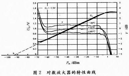 式中:b為截距;Ks為對數(shù)檢測器的斜率,是一個(gè)常數(shù);Pin是輸入信號的功率。在一定的動態(tài)范圍內(nèi),可通過Matlab仿真軟件得到對數(shù)放大器的特性曲線,如圖2所示。