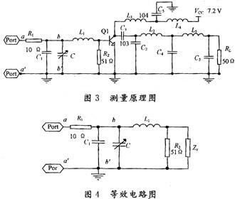 下面僅說明測量射頻功率管2SC1971的輸入阻抗的具體過程,輸出阻抗的測量方法與此相似。圖3是測量2SC1971的輸入阻抗的原理圖,圖4是他的等效電路圖。R1的值設(shè)計(jì)為10 Ω左右,以減少輸入的功率,同時(shí)HA由R1組成比較簡單,便于計(jì)算,HB由L1,C1,R2組成,同時(shí)也是功率管的匹配和偏置網(wǎng)絡(luò)。HA,HB也可以由多級(jí)L型或Ⅱ型雙口網(wǎng)絡(luò)組成,只是計(jì)算量增大。經(jīng)過實(shí)測采用單級(jí)L型網(wǎng)絡(luò)在bb′處測得的波形比較接近正弦波,測量出的結(jié)果誤差不大。