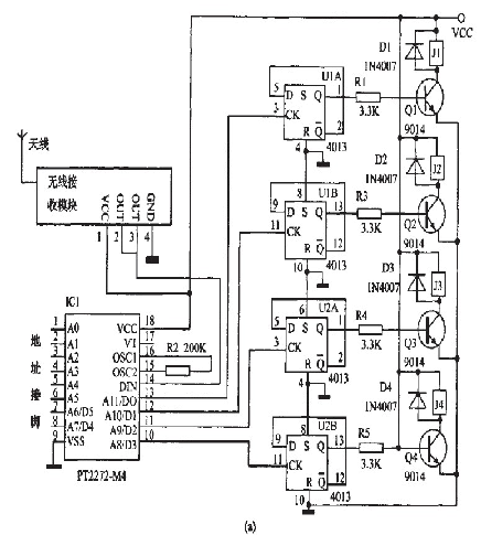 所以輸出接口在未解碼時就為低電平輸出了,即為非鏤狀態(tài)。所以如果將蠶2(a)中酶PT2272--M4改為Pr2272~L4,相應(yīng)的將原理網(wǎng)圖2(a)改為圖3,也能實現(xiàn)同樣的功能,即四路非鎖狀態(tài)。如果將某一路改為蠢錟狀態(tài),將耀應(yīng)的二極管去掉幫霹。鍘如,去掉D5,就將PT2272--L4的第13腳的非自鎖定輸出改為錟定輸出。