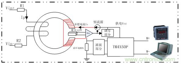 閉環(huán)式霍爾電流變送器是在直測(cè)式霍爾電流傳感器的基礎(chǔ)上發(fā)展起來的,主要由原邊電路、聚磁環(huán)、霍爾器件、次級(jí)線圈和放大電路、采樣電路、調(diào)零電路以及隔離變送模塊組成,如圖1。主回路電流IP 在聚磁環(huán)所產(chǎn)生的磁場(chǎng),通過一個(gè)次級(jí)線圈的電流產(chǎn)生的磁場(chǎng)進(jìn)行補(bǔ)償,使霍爾器件始終處于檢測(cè)零磁通的工作狀態(tài)。流經(jīng)次級(jí)線圈的電流Is經(jīng)過精密電阻RL進(jìn)行采樣,為了減小恒流源的負(fù)載能力,此精密電阻RL的阻值較小。精密電阻將電流信號(hào)變換成mV的電壓信號(hào),此信號(hào)經(jīng)過濾波器的濾波作用后直接接入金升陽TM系列信號(hào)調(diào)理模塊進(jìn)行信號(hào)隔離放大變換,變換換成工業(yè)需要的標(biāo)準(zhǔn)信號(hào),如4-20mA、0-20mA、 l-5V、0-5V等標(biāo)準(zhǔn)直流信號(hào),供給智能儀表顯示或者直接供給現(xiàn)場(chǎng)PLC或DCS系統(tǒng)使用。如果原邊電流Ip發(fā)生變化,則Ip產(chǎn)生的磁通發(fā)生變化,則在霍爾元件的兩表面產(chǎn)生電勢(shì)差,此電勢(shì)差經(jīng)過運(yùn)放的放大作用,直接控制Is補(bǔ)償電流的大小,此補(bǔ)償電流恰好與被測(cè)電流的方向相反,從而補(bǔ)償了原來的磁場(chǎng),使得霍爾器件處于零磁通的狀態(tài)中。所以Is的電流可以真實(shí)地反映出原邊Ip的電流的變化,反應(yīng)速度快。
