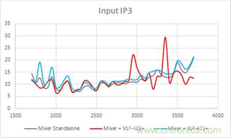 同樣的,在IP3的測試曲線也顯示了混頻器輸出端配對傳統(tǒng)濾波器后導致的不穩(wěn)定曲線。而使用無反射式濾波器配對混頻器的輸出端則使得IP3性能與混頻器本身的IP3性能保持一致。