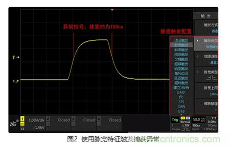 通過Step1,可以大概了解到異常信號的特性,將其特有的條件視為觸發(fā)條件,利用觸發(fā)可快速的捕獲異常信號。ZDS2000系列示波器免費標配了多種“觸發(fā)類型”,其中包括11種基礎觸發(fā),21種協(xié)議觸發(fā)。另外,用戶還可根據(jù)波形的形狀特性,使用“模板觸發(fā)”,讓觸發(fā)更加隨心所欲。