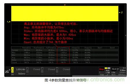 僅僅通過波形的直觀表現(xiàn)來分析異常信號遠遠不夠,只有將波形各項指標精確量化,才能看透波形異常的本質。ZDS2000系列示波器標配的51種“真正意義”的參數(shù)測量,會把屏幕上捕獲的所有波形進行統(tǒng)計分析,得出每一項的當前值、最大值、最小值、平均值、標準差、統(tǒng)計次數(shù),用戶通過觀察最大值和最小值可快速了解波形中可能存在的異常,通過觀察平均值、標準差可快速評估信號特性。