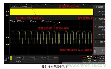 在調試異常信號時,我們通常需要明確,異常出現(xiàn)的頻率是多少,是不是周期性出現(xiàn)的呢?為了弄清楚這些問題,一般需要長時間記錄波形,然后基于這樣一個龐大的數(shù)據(jù)庫去定位和分析異常。ZDS2000系列示波器標配的“搜索功能”,可以在海量的數(shù)據(jù)中快速定位出感興趣的信號,并自動做出標記,用戶通過觀察標記可快速了解異常的位置、頻率、周期等特性。