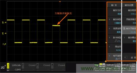 如下圖所示,設(shè)置了欠幅觸發(fā)及普通觸發(fā)后,欠幅脈沖信號被觸發(fā),穩(wěn)定的顯示在屏幕上。