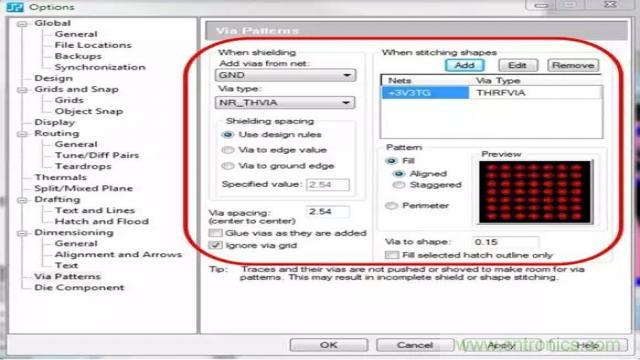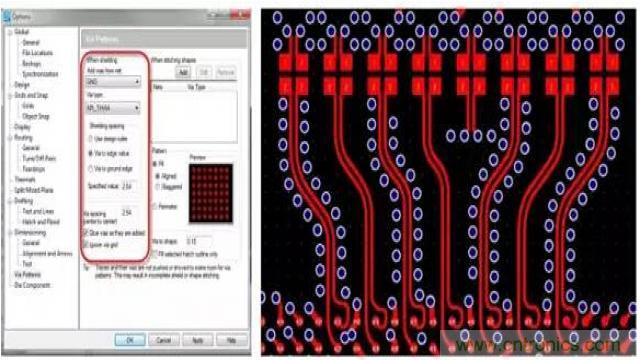 射頻設(shè)計的另一個重要方面是確保正確地屏蔽帶過孔的區(qū)域。盡管此任務(wù)可由設(shè)計人員手動進(jìn)行,但這個過程極其耗時。如果PCB 設(shè)計工具能夠自動完成此過程,將可以縮短設(shè)計周期時間并確保符合您的所有設(shè)計規(guī)則。利用此類工具,設(shè)計人員可以指定過孔模式生成規(guī)則,而將剩余的工作全部交由PCB 設(shè)計工具完成。