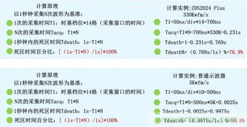 死區(qū)時間(處理時間):是示波器對采樣存儲回來的數(shù)字信號進行測量運算,顯示等處理的過程。死區(qū)時間內(nèi)示波器不進行采集。
