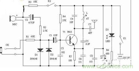 【導(dǎo)讀】FM調(diào)頻發(fā)射機(jī),發(fā)射頻率在模擬廣播波段88~108Mhz,用普通FM收音機(jī)接收,2種音信輸入,MIC頭將周邊聲音發(fā)送,CK音信輸入,調(diào)??烧{(diào)發(fā)射線圈L可改變(微調(diào))發(fā)射頻率。