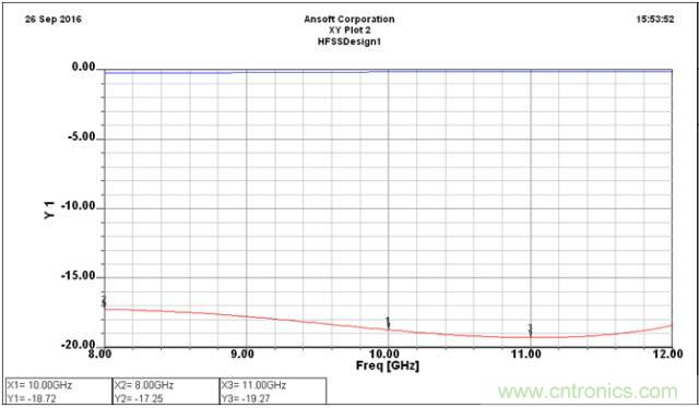 添加的C形環(huán)受到相同的磁場耦合,產(chǎn)生與主線相反的電流,從而對(duì)主線進(jìn)行二次耦合,增強(qiáng)了主線的耦合度。仿真了1mm耦合間距的耦合度,仿真結(jié)果如下圖4所示。在10GHz耦合-18.72dB,x波段耦合度-17.25~-19.27dB,波動(dòng)2dB左右。