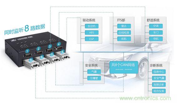 若將每個節(jié)點單獨取出做測試,則必然破壞原有通信規(guī)則。如何在不破壞原有通信的基礎上搞清楚一個陌生的收發(fā)協議呢?所謂工欲善其事,必先利其器。您需要一個能同時收發(fā)、轉送多路CAN數據的CAN卡,USBCAN-8E-U正是為這種應用而生。