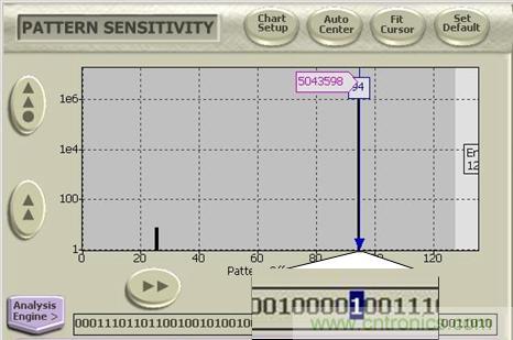在客戶進(jìn)行誤碼測試的時(shí)候,由于鏈路的損耗和芯片的輸出特性,導(dǎo)致出現(xiàn)了誤碼,但客戶卻想知道究竟是哪一個(gè)bit位出現(xiàn)了誤碼,以定位誤碼出現(xiàn)的根源。設(shè)置Bert的輸出/輸入端設(shè)置為PRBS7的碼型,在誤碼分析功能里面選擇Patten Sensitivity,則可以直接觀察PRBS7的127個(gè)比特的每一位所出現(xiàn)誤碼的個(gè)數(shù),看最多誤碼所對應(yīng)的比特位的前后特性,如下圖十三,移動(dòng)光標(biāo)到任意一個(gè)比特上面,可以看到連續(xù)多個(gè)0而中間有一個(gè)1跳變的bit即127比特的第94比特出現(xiàn)誤碼的個(gè)數(shù)最多,達(dá)到5043598個(gè)誤碼。從而判斷由于鏈路ISI的影響導(dǎo)致突然的跳變位出現(xiàn)較高的誤碼率。