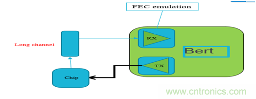 客戶的芯片的接收端可以支持FEC的糾錯(cuò)功能,但要測試在不同的channel條件和不同的發(fā)送端均衡的設(shè)定下,芯片經(jīng)過FEC后的誤碼率能降低到多少,如果將信號直接環(huán)回到芯片的輸入端的話,需要不停的修改芯片的FEC的參數(shù)來進(jìn)行測試,但由于其芯片每修改一次FEC的參數(shù)如FEC的symbol size, block size,content size等等都需要重新對芯片進(jìn)行代碼編譯和下載,每次下載需要幾分鐘的時(shí)間,由于不同的條件都要測試,則組合數(shù)量很多,導(dǎo)致測試效率非常低。