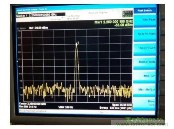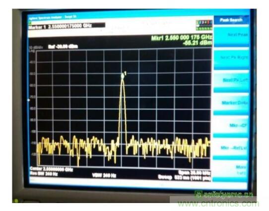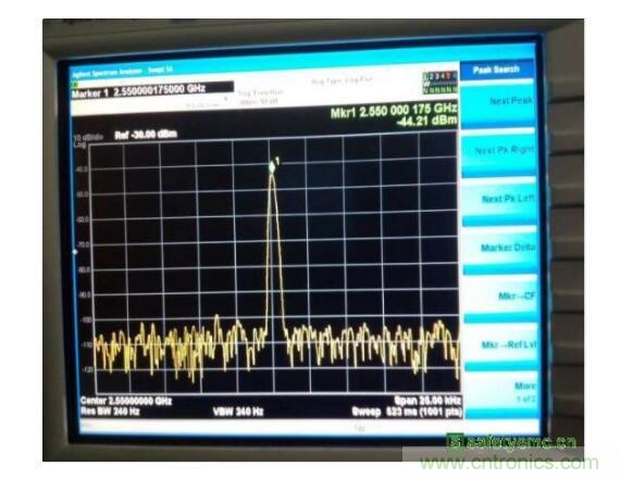 針對輻射問題,我們要尋找出干擾的噪聲,使用頻譜分析儀在頻域分析會更快速精準的找出方案。這里我們使用性價比較高的CXA N9000A頻譜分析儀,搭配使用N9311X 套件中的磁場環(huán)形探針來掃描手機的近場雜訊。通過使用較低靈敏度的環(huán)形探頭可以發(fā)現(xiàn)在天線區(qū)域存在較大的諧波,如圖3所示 2.55GHz峰值達到了 -43.29dBm。