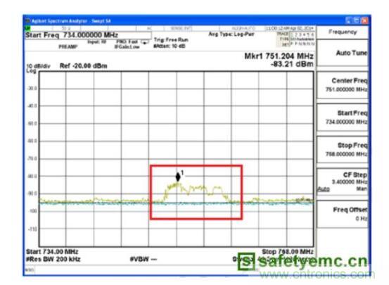 經(jīng)過查閱電源和芯片文檔得知其開關(guān)頻率的大約為1.9M,該頻率成分的電源噪聲會在調(diào)制過程中頻移到信號頻率兩側(cè)。然而由于使用較低靈敏度的探頭智能確定處板上下半部分都是可能的輻射雜散信號源,卻無法定位精確的位置。此時我們需要進一步使用套件中精度更高的磁場環(huán)形探頭或者垂直向磁場探頭來確定最強區(qū)域。最終發(fā)現(xiàn)在750MHz+/-17MHz在紅色框標示區(qū)域最強。測試結(jié)果請參考圖7所示,此處750MHz附近的近場輻射為-83.21dBm,2.25GHz處最大近場輻射為-44.18dBm。