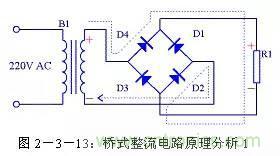 由圖2-3-13可以看出在電源正半周時(shí),B1次級(jí)上端為正,下端為負(fù),整流二極管D4和D2導(dǎo)通,電流由變壓器B1次級(jí)上端經(jīng)過(guò)D4、R1、D2回到變壓器B1次級(jí)下端;由圖2-3-14可以看出在電源負(fù)半周時(shí),B1次級(jí)下端為正,上端為負(fù),整流二極管D1和D3導(dǎo)通,電流由變壓器B1次級(jí)下端經(jīng)過(guò) D1、R1、D3回到變壓器B1次級(jí)上端。R1兩端的電壓始終是上正下負(fù),其波形與全波整流時(shí)一致。