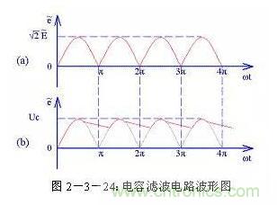 (1)電容濾波電路電容濾波電路圖見(jiàn)圖2-3-23,電容濾波電路是利用電容的充放電原理達(dá)到濾波的作用。在脈動(dòng)直流波形的上升段,電容C1充電,由于充電時(shí)間常數(shù)很小,所以充電速度很快;在脈動(dòng)直流波形的下降段,電容C1放電,由于放電時(shí)間常數(shù)很大,所以放電速度很慢。在C1還沒(méi)有完全放電時(shí)再次開(kāi)始進(jìn)行充電。這樣通過(guò)電容C1的反復(fù)充放電實(shí)現(xiàn)了濾波作用。濾波電容C1兩端的電壓波形見(jiàn)圖2-3-24(b)。
