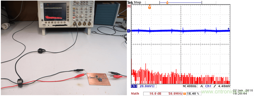 在此實(shí)驗(yàn)中,我們使用雙面PCB,輸入電容的放置位置如上面的實(shí)驗(yàn)2一樣,這樣的配置可以在輸入回路中引入比較明顯的輻射。