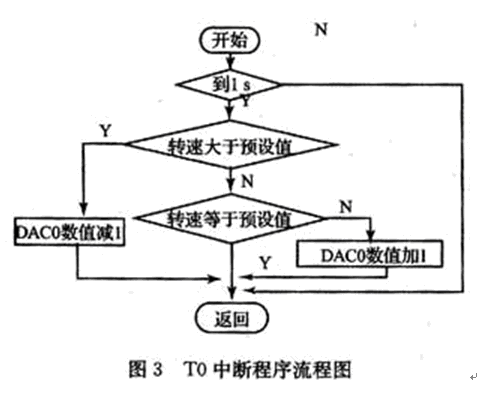 本系統(tǒng)采用C8051F060中的INT0中斷對轉(zhuǎn)速脈沖計數(shù)。定時器T1工作于外部事件計數(shù)方式對轉(zhuǎn)速脈沖計數(shù);T0工作于定時器方式均工作于方式1。每到1 s讀一次計數(shù)值,此值即為脈沖信號的頻率,根據(jù)式(1)可計算出電機(jī)的轉(zhuǎn)速。由于直流電機(jī)的轉(zhuǎn)速與施加工于電機(jī)兩端的電壓大小有關(guān),故將實(shí)際測得的轉(zhuǎn)速值與預(yù)設(shè)的轉(zhuǎn)速值比較,若大于預(yù)設(shè)的轉(zhuǎn)速值則減小DAC0的數(shù)值,若小于轉(zhuǎn)速預(yù)設(shè)的轉(zhuǎn)速值則增加DAC0的值調(diào)整電機(jī)的轉(zhuǎn)速,直到轉(zhuǎn)速值等于預(yù)設(shè)定的值,這樣就實(shí)現(xiàn)了對電機(jī)轉(zhuǎn)速的控制,主程序和T0中斷流程圖如圖2、3所示。