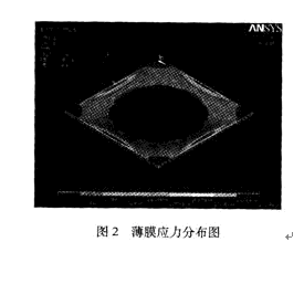 利用有限元分析軟件ANSYS對(duì)接觸式結(jié)構(gòu)的薄膜工作狀態(tài)進(jìn)行了模擬。材料為Si,膜的形狀為正方形,邊長(zhǎng)1000 μm,膜厚5 μm,極板間距10 μm。在1.01×105Pa的大氣壓力下,薄膜中央接觸部分及四個(gè)邊角基本不受應(yīng)力,四邊中央應(yīng)力最大為1.07 MPa,小于硅的屈服應(yīng)力7 MPa,其應(yīng)力分布如圖2所示。
