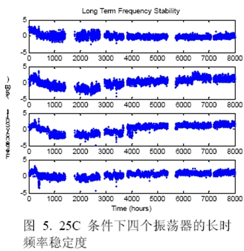 圖6顯示了在進行溫度循環(huán)試驗時兩個振蕩器的頻率穩(wěn)定度。數(shù)據(jù)在-50℃到+80℃正溫度循環(huán)和負(fù)溫度循環(huán)中的30℃情況下獲得,數(shù)據(jù)采集自600個溫度循環(huán),以3ppm為規(guī)范容許范圍則沒有頻率漂移。