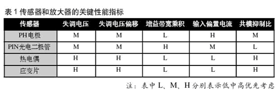 選擇放大器與傳感器正確接口時,設(shè)計人員必須使放大器與傳感器特性匹配。可靠的放大器特性對于傳感器——放大器組合的工作是關(guān)鍵性的。傳感器和放大器的關(guān)鍵性能指標(biāo)見表1。例如,PH電極是一個高阻抗傳感器,所以,放大器的輸入偏置電流是優(yōu)先考慮的(表中的H)。PH傳感器所提供的信號不允許產(chǎn)生任何相當(dāng)大的電流,所以,放大器必須是在工作時不需要高輸入偏置電流的型號。具有低輸入偏置電流的高阻抗MOS輸入放大器是符合這種要求的最好選擇。另外,對于應(yīng)用增益帶寬乘積(GBP)是低優(yōu)先考慮(表1中L),這是因為傳感器工作在低頻,而放大器的頻率響應(yīng)不應(yīng)該妨礙傳感器信號波形的真正再生。