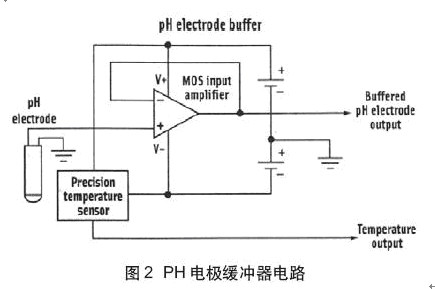 高阻抗PH傳感器可與具有低功率電路(僅需要2個1.5V電池供電)的放大器配對(圖2)。放大器MOS輸入晶體管為傳感器提供高阻抗,傳感器輸出阻抗為1MW或更大。此放大器的輸入偏置電流小于1pA,所以,放大器工作消耗非常小的電流。放大器的失調(diào)電壓小于1mV。放大器提供軌到軌工作并具有高驅(qū)動能力,能在長線上發(fā)送信號(放大器遠(yuǎn)離ADC的情況)。在電路中增加了一個精密溫度傳感器,可以測量PH傳感器的溫度。這使得具有精確的PH溫度補償值。