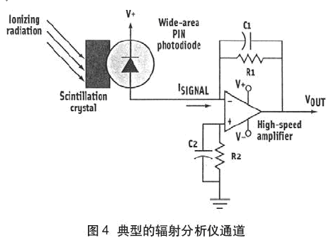 輻射譜測量來自輻射源的發(fā)射能量的分布,輻射源可以是粒子,X射線或γ射線。輻射照到閃光晶體上并發(fā)射強度正比于能量的短脈沖。然后由PIN光電二極管把光轉(zhuǎn)換為電流。放大器(見圖4)用做首置放大器和PIN光電二極管輸出的電流/電壓轉(zhuǎn)換器。此電路為用于基本輻射譜的單通道分析儀。信號的脈沖幅度包含重要信息,所以低輸入失調(diào)電壓和低失調(diào)電壓漂移是重要的。寬帶寬為處理脈沖(可窄到幾納秒)提供快速響應(yīng)。首置放大器輸出(VOUT)到脈沖幅度分析儀(如快速ADC)來測量和儲存每個峰值發(fā)生的數(shù)。分布是單個源的光譜。反饋電阻R1值取決于來自PIN光電二極管的最大電流和到ADC的最大輸出電壓。因此,R1=(Max VOUT)/(Max ISIGNAL)。電容C1用于PIN光電二極管寄生電容的補償。R2和C2相當(dāng)于R1和C1用于補償放大器非倒相輸入的輸入偏置電流。