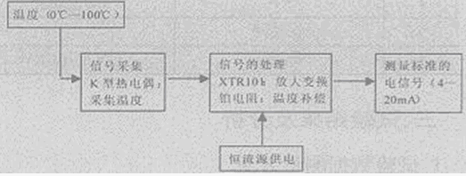 整套系統(tǒng)要求在0~100℃范圍對應(yīng)輸出4mA~20mA的電流型溫度變送器。
