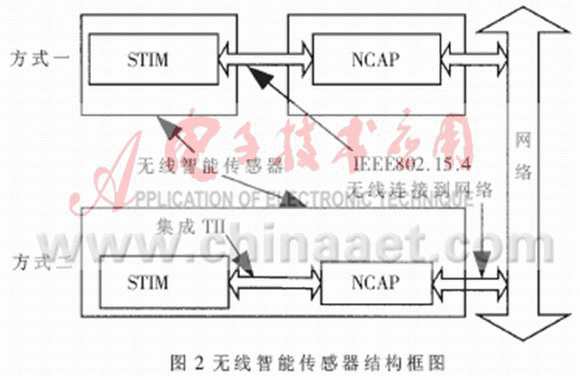 方案之一是無線STIM(智能傳感器接口模型):STIM與NCAP之間不再是TII接口(傳感器獨立接口),而是通過IEEE802.15.4無線(收發(fā)模塊)傳輸信息。傳感器或執(zhí)行器的信息由STIM通過無線網(wǎng)絡(luò)傳遞到NCAP終端,進而與有線網(wǎng)絡(luò)相連。另外,還可以在NCAP與網(wǎng)絡(luò)間的接口替換為無線接口。