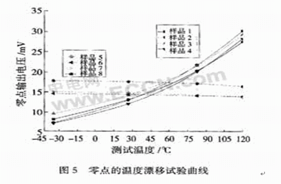 由于芯片對所處環(huán)境的要求比較特殊,所以與硅芯片接觸的硅油需要具備以下特點(diǎn):良好的介電性能、盡可能小的熱脹系數(shù)、化學(xué)穩(wěn)定性好以及耐熱和耐寒性能好。硅油的凈化處理是薄膜隔離式壓力傳感器封裝中至關(guān)重要的工藝步驟,因?yàn)槿魞艋桓蓛?,硅油或傳感器受壓部分的充油腔?nèi)就會(huì)混有氣體、水分等可壓縮、易揮發(fā)的物質(zhì),在全溫區(qū)內(nèi)的體積變化就會(huì)沒有規(guī)律可言,造成外界的待測壓力不能準(zhǔn)確、規(guī)則地傳遞到芯片,從而使得壓力傳感器的溫漂比較嚴(yán)重。這種現(xiàn)象反映在零點(diǎn)的溫漂上,可以用來評價(jià)封裝的好壞。通常,由于在恒壓源激勵(lì)的情況下壓力傳感器的靈敏度溫度系數(shù)為負(fù)值,所以壓力傳感器的零點(diǎn)稍有下降,如圖5的樣品5,6,7,8所示;而硅油凈化不充分的壓力傳感器零點(diǎn)的溫漂卻非常大,且隨著溫度的升高而升高,如圖5中的樣品1,2,3,4所示。試驗(yàn)表明,像樣品1,2,3,4這類溫漂很大的傳感器的溫度補(bǔ)償是比較困難的,所以封裝時(shí)必須確保硅油品質(zhì)和填充量恰到好處。