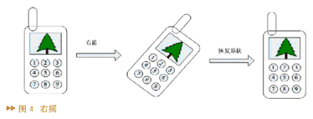 系統(tǒng)設(shè)計(jì)了六種動(dòng)作,他們分別是左搖、右搖、下?lián)u、上搖、圖片左轉(zhuǎn)、圖片右轉(zhuǎn)。圖4中的圖形象地說(shuō)明了其中的兩個(gè)動(dòng)作,其它的動(dòng)作與此類(lèi)似。