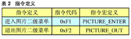 系統(tǒng)還定義了單片機(jī)與演示終端交互的指令,用于系統(tǒng)在主菜單和二級(jí)菜單之間的界面切換,指令從演示系統(tǒng)通過(guò)SCI傳給單片機(jī),單片機(jī)接收到之后進(jìn)入或退出二級(jí)菜單,見(jiàn)表2。
