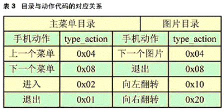 仿真器的外觀和操作類(lèi)似一部移動(dòng)電話,但是并不代表某個(gè)特定的設(shè)備,而是提供對(duì)其所支持的API 的正確實(shí)現(xiàn),每個(gè)命令按鈕對(duì)應(yīng)著相應(yīng)的API函數(shù)。從圖6中可以看到手機(jī)的導(dǎo)航鍵,我們更改了導(dǎo)航鍵的API函數(shù),使其從鼠標(biāo)單擊觸發(fā)的方式轉(zhuǎn)換為串口動(dòng)作代碼控制。首先,我們編寫(xiě)了J2ME的串口接收程序,用于接收從單片機(jī)傳來(lái)的單字節(jié)的type_action值;然后將type_action以參數(shù)的形式傳給API,手機(jī)根據(jù)不同的type_action值執(zhí)行不同的動(dòng)作,包括菜單上下翻、進(jìn)出二級(jí)子菜單、圖片翻轉(zhuǎn)等。手機(jī)動(dòng)作與type_action的對(duì)應(yīng)關(guān)系如表3。