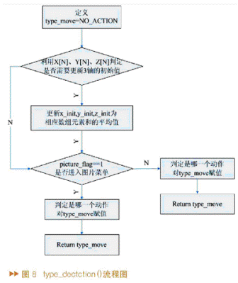 動(dòng)作檢測(cè)主要是用獲得的三組數(shù)據(jù)值x_data[N]、y_data[N]、z_data[N]來(lái)判定當(dāng)前動(dòng)作是系統(tǒng)設(shè)定動(dòng)作中的哪一個(gè),如果符合,則發(fā)送這個(gè)動(dòng)作對(duì)應(yīng)的預(yù)定義值給演示終端,否則發(fā)送NO_ACTION。type_dectction()用來(lái)實(shí)現(xiàn)動(dòng)作檢測(cè),其中type_move為函數(shù)內(nèi)部變量,用于記錄動(dòng)作代碼。type_dectction()進(jìn)行動(dòng)作檢測(cè)的流程如圖8所示。