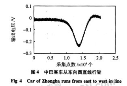 圖3、圖4比較可以看出:橫軸顯示圖3有效信號(hào)的跨度比圖4的小,圖3中輸出磁信號(hào)的幅值大于0.4V,而圖4中小于0.3 V,即圖3中的輸出信號(hào)幅值比圖4中的大。這是因?yàn)閳D3中的目標(biāo)移動(dòng)速度較大,另外,由于2個(gè)目標(biāo)不同,即對(duì)傳感器周圍的磁場(chǎng)影響程度不一樣,故測(cè)得的輸出信號(hào)幅值也不同。