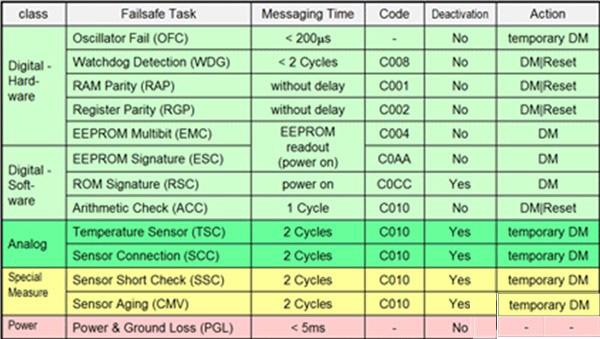 ZMD31150中的臨時(shí)DM是一個(gè)可選項(xiàng),在錯(cuò)誤持續(xù)出現(xiàn)時(shí)提供可靠的錯(cuò)誤信息。利用附加信息(如冗余傳感器或進(jìn)行大量檢查),ECU將決定當(dāng)前應(yīng)用能否繼續(xù)可靠工作,或者根據(jù)錯(cuò)誤消息必須關(guān)斷。
