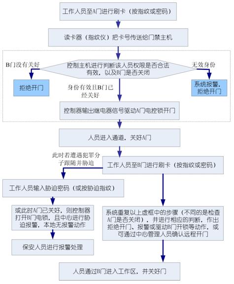首先解釋一下AB門雙門互鎖的概念,所謂雙門互鎖聯(lián)動是指AB兩道門具有互鎖聯(lián)動的功能,即當(dāng)一道門被打開時,另一道門將打不開,只有當(dāng)兩道門都關(guān)上時,才能打開其中的任一道門。在高安全場所通道門禁應(yīng)用中,特定人員進(jìn)入第一道門后必須要按照操作要求鎖好第一道門才能進(jìn)入第二道門,如進(jìn)入第一道門后沒按要求關(guān)好此道門,將不能進(jìn)入第二道門,這樣做的目的是為了防止犯罪分子尾隨作案。