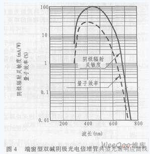 光電倍增管由陰極收入射光子的能量并將其轉(zhuǎn)換為光子,其轉(zhuǎn)換效率(陰極靈敏度)隨入射光的波長而變。這種光陰極靈敏度與入射光波長之間的關(guān)系叫做光譜響應(yīng)特性。圖4給出了雙堿光電倍增管(其光陰極材料為Sb-Rb-Cs和Sb-K-Cs)的典型光譜響應(yīng)曲線。
