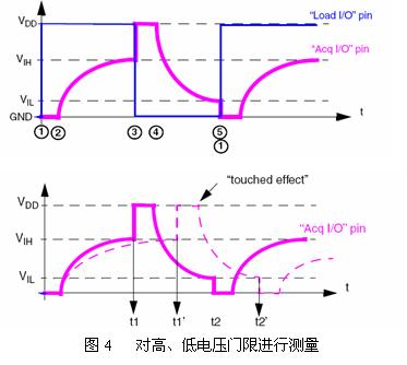 為了提高系統的可靠性和穩(wěn)定性,改進的測量方法是對Vout進行高和低兩個門限進行測量。如圖4所示,通過對t1和t2的測量,從而達到更可靠的效果。另外,多次測量也是有效的降低高頻干擾的有效方法。