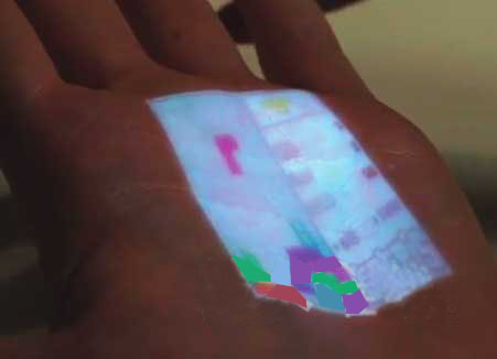 Skinput還將顯示器功能單獨分割出來。具體實現(xiàn)方法是,利用小型投影儀,將手掌及手臂作為顯示器使用(右上方的圖片)。