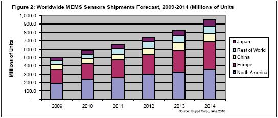 圖2所示為iSuppli公司對(duì)2009-2014年MEMS傳感器市場(chǎng)的預(yù)測(cè)。