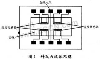 圖1是由清華大學(xué)設(shè)計(jì)、中國(guó)電子集團(tuán)第13研究所加工而成的微流體陀螺儀。它是利用氣體流速方向在哥氏加速度作用下發(fā)生偏轉(zhuǎn)的原理,采用微機(jī)械加工工藝制作的。此微流體傳感器由隔熱腔體、加熱器和兩對(duì)對(duì)稱的溫度傳感器構(gòu)成。加熱器和溫度傳感器懸在腔體上面。加熱器加熱使其周圍的氣體溫度升高,密度減小。在重力加速度的作用下,腔體內(nèi)的氣體發(fā)生對(duì)流。位于加熱器相等距離上的一對(duì)溫度傳感器用來測(cè)量加熱器兩邊的溫差。