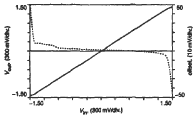 在中部電源電壓區(qū),PMOS和NMOS輸入對是有效的,而且它們的偏置電流通過電流鏡M4P--M5P和M4N--M5N鏡像到該電路的輸出端。這種結(jié)構(gòu)允許NMOS輸入對驅(qū)動在電源電壓區(qū)的輸出節(jié)點(diǎn)接近VDD.而PMOS控制輸出端的電壓范圍接近VSS.不幸的是,在接近VDD時(shí),P溝道輸入對截止,而且沒有電流被鏡像到輸出端的底部,關(guān)閉了緩沖器。類似的情況是VSS時(shí).N溝道差分對不是有效的。為了這個(gè)原因,晶體管M1PR-M5PR和MlNR-M5NR已包括在圖2中,維持在整個(gè)電壓范圍內(nèi)是有效的。