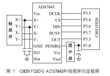 ADS7843是一種四線式觸摸屏控制器,目前較多應用于電阻式觸摸屏輸入系統(tǒng)中。盡管有很多相關的典型應用和應用注意事項,但是在實際使用過程中仍然會遇到一些問題。應用在通用的單片機中所出現(xiàn)的問題及解決方法,已有一些介紹。本文是對基于高速、流水線結(jié)構(gòu)的 C8051的觸摸屏控制系統(tǒng)設計中所遇到的問題進行分析處理,并給出了解決方法。