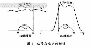 濾波電路的作用主要是對(duì)輸入信號(hào)進(jìn)行處理,通常是希望濾出噪聲。濾波器種類(lèi)很多,從大的方向可分為經(jīng)典濾波器與現(xiàn)代濾波器兩大類(lèi)。經(jīng)典濾波器可濾出與有用信號(hào)占用不同頻帶的噪聲,但對(duì)有用信號(hào)與噪聲的頻譜相互重疊的情況卻無(wú)能為力。圖4所示是信號(hào)與噪聲的頻譜,圖4中,S(f)為有用信號(hào),頻帶為f1~f2,N(f)為噪聲,經(jīng)濾波后只能濾出f1~f2以外的噪聲,噪聲與信號(hào)重疊部分無(wú)法濾出。