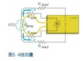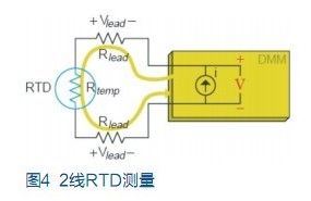 與熱敏電阻相似,鉑電阻溫度傳感器(RTD)也是用鉑制成的熱敏感電阻。當(dāng)通過(guò)測(cè)量電壓計(jì)算RTD 溫度時(shí),數(shù)字萬(wàn)用表用已知電流源測(cè)量該電流源所產(chǎn)生的電壓。這一電壓為兩條引線(Vlead)上的壓降加RTD上的電壓(Vtemp)。例如,常用RTD 的電阻為100Ω,每1℃僅產(chǎn)生0.385Ω的電阻變化。如果每條引線有10Ω電阻,就將造成26℃的測(cè)量誤差,這是不可接受的。所以應(yīng)對(duì)RTD作4線歐姆測(cè)量。
