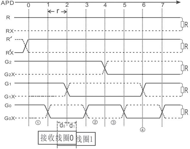 在t0、t1、t2、t3、t4時(shí)間段,分別向傳輸對(duì)線R、R’、G2、G1、G0發(fā)送載波信號(hào),在t5時(shí)間段不發(fā)送。車上天線箱中有兩個(gè)接收線圈:接收線圈0和接收線圈1。APD檢測(cè)是從接收線圈0感應(yīng)信號(hào)的相位中得到APD位置。在t0時(shí)間段,線圈0感應(yīng)的是R線發(fā)送的信號(hào),稱為R信號(hào);在t1時(shí)間段,線圈0感應(yīng)的是R’信號(hào),R’信號(hào)與R信號(hào)反相,記為=1,作為起始位;在t2時(shí)間段,線圈0感應(yīng)的是G2線發(fā)送的信號(hào),G2=0或1,取決于接收線圈0的位置。若接收線圈0的中線分別在①、②、③、④的位置,則接收線圈0的接收信號(hào)的相位如圖3所示。