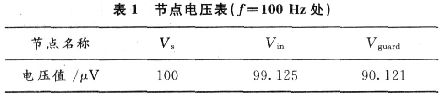 對圖2所示的電路,用PSpice仿真軟件對電路進(jìn)行模擬分析,交流掃描的結(jié)果如下,各關(guān)鍵節(jié)點(diǎn)電壓如表1所示,電阻R1的低阻抗端加上了90.121μV的保護(hù)電壓,流經(jīng)電阻R1的分流電流為90.031 fA。